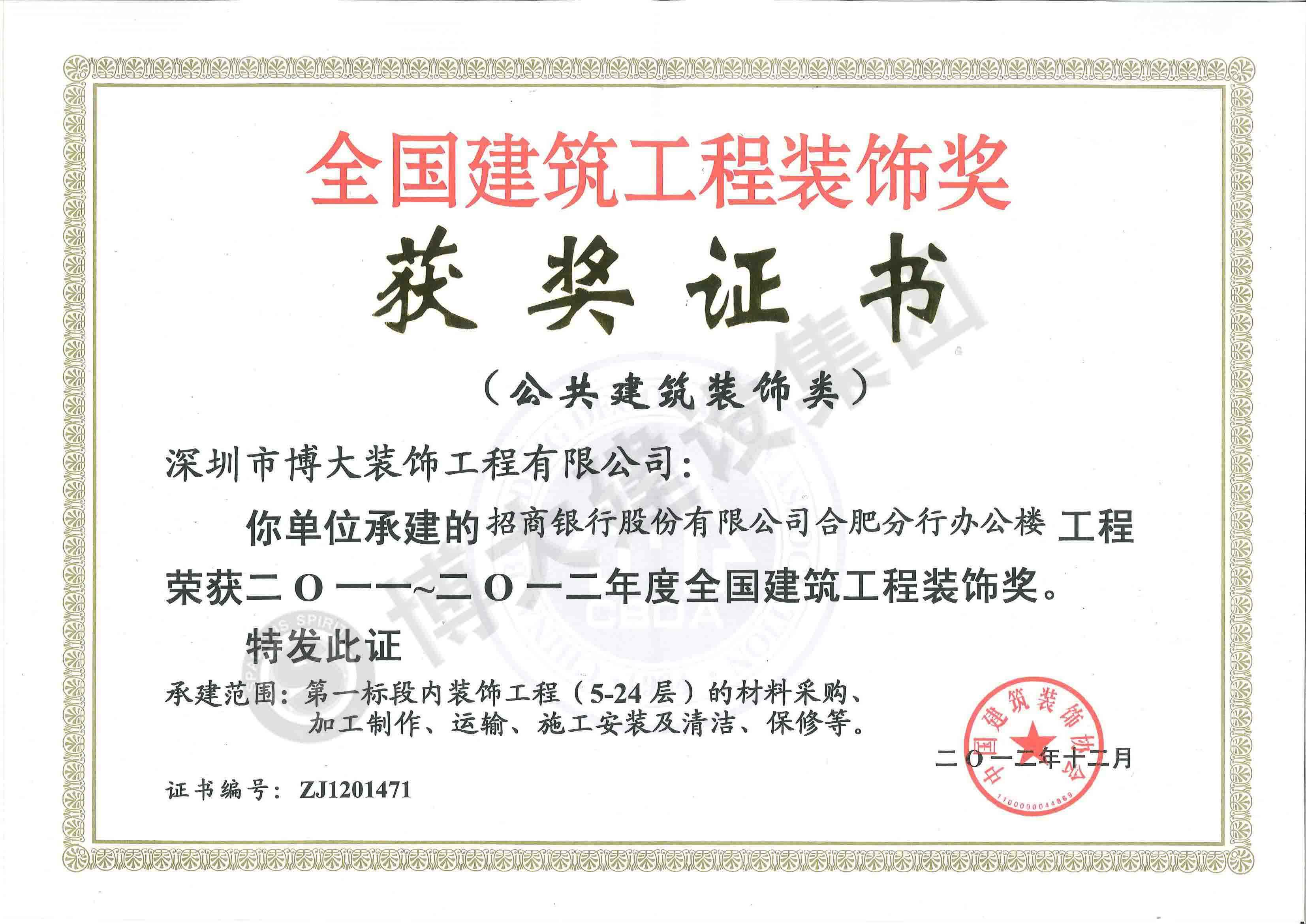 中國建筑工程裝飾獎(jiǎng)(招商銀行合肥分行-裝飾)