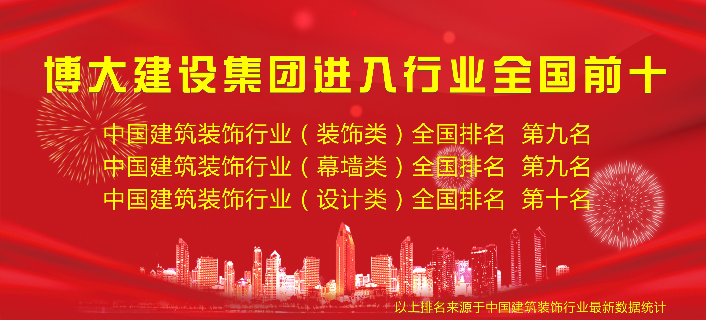 2019年1月9日,中國建筑工程裝飾頒獎(jiǎng)大會(huì)在北京隆重舉行,根據(jù)中國建筑裝飾行業(yè)綜合數(shù)據(jù)統(tǒng)計(jì),博大建設(shè)集團(tuán)憑借綜合實(shí)力,以奮進(jìn)姿態(tài)挺進(jìn)行業(yè)全國前十,其中,裝飾類排名全國第九、幕墻類排名全國第九、設(shè)計(jì)類排名全國第十。