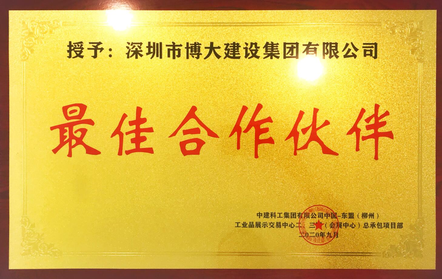 在中國—東盟(柳州)工業(yè)品展示交易中心項目建設中,博大人矢志不渝地踐行“讓顧客有幸福感”的企業(yè)魂,牢記“將履約視為生命”的莊嚴承諾,不講條件、全力以赴,最終以過硬的工程質量、切實的工期保障、卓越的履約能力得到甲方的高度認可,榮獲中建科工集團有限公司頒發(fā)的“最佳合作伙伴”!