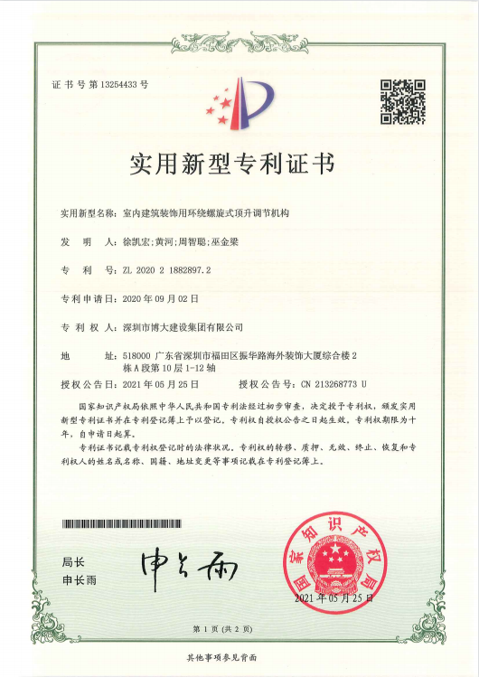 專利成果分別是《室內(nèi)建筑裝飾用環(huán)繞螺旋式頂升調(diào)節(jié)機(jī)構(gòu)》、《一種GRG吊頂安裝結(jié)構(gòu)》、《一種PC預(yù)制混凝土構(gòu)件下的特大推拉窗》、《一種帶有支撐構(gòu)件的超大空間頂轉(zhuǎn)換層結(jié)構(gòu)》、《一種單元拼接式鋁板吊頂或裝飾線條》等22項獲得由國家知識產(chǎn)權(quán)局頒發(fā)的專利證書。